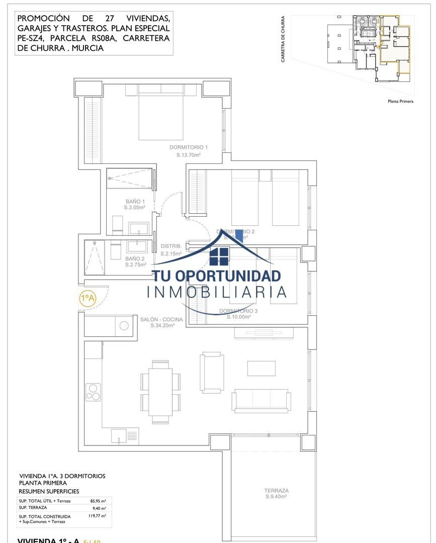 Se vende. Piso de obra nueva ubicada entre Juan Carlos I y Juan de Borbón, “carretera de Churra”.