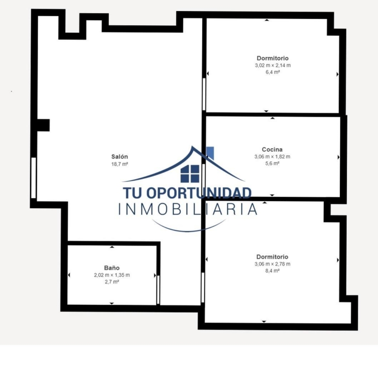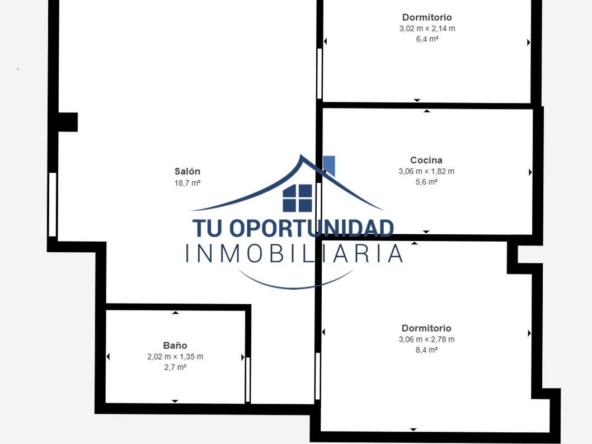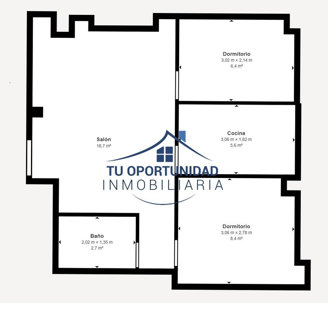 60 m² Construidos, salón, cocina, baño y 2 dormitorios.